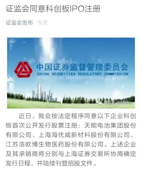 近日,我会按法定程序同意以下企业科创板首次公开发行股票注册:天能电池集团股份有限公司、上海海优威新材料股份有限公司、江苏浩欧博生物医药股份有限公司。上述企业及其承销商将分别与上海证券交易所协商确定发行日程,并陆续刊登招股文件。